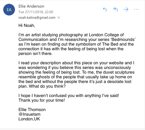 When I first discovered this piece I instantly thought of how we use beds. We encase our pillows and duvets in pillowcases and sheets. We sleep, sit, talk and sometimes eat on it. Noah's piece made me think about the ways we treat our bed and what the bed means to us in our lives. Usually, it's a safe haven that we can't wait to get back into at the end of the day.