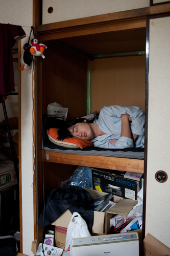 The photos show a repetitive distance between him and the subject he is photographing. Almost as if he is visualizing Hikikomori through photography. He notices that around him there's barely any interaction and that there's always a distance between him and his subject. The only time that there isn't any distance is when his subjects are asleep - In the photos, he is a lot closer than when the subjects are awake. This appears to be the only time he can interact with them. I definitely feel the feeling of total isolation and lost when looking at this piece of work.